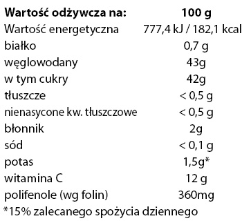 Ingredients: koncentrat soku z granatu (koncentrowany próżniowo, częściowo przefermentowany), sok z owocu dzikiej róży, cukier trzcinowy, woda różana, wyciąg z winogron, aromat naturalny – ekstrakt waniliowy, kwas cytrynowy, substancja żelująca – pektyna owocowa, przyprawy, substancja słodząca – glikozydy stewiolowe.