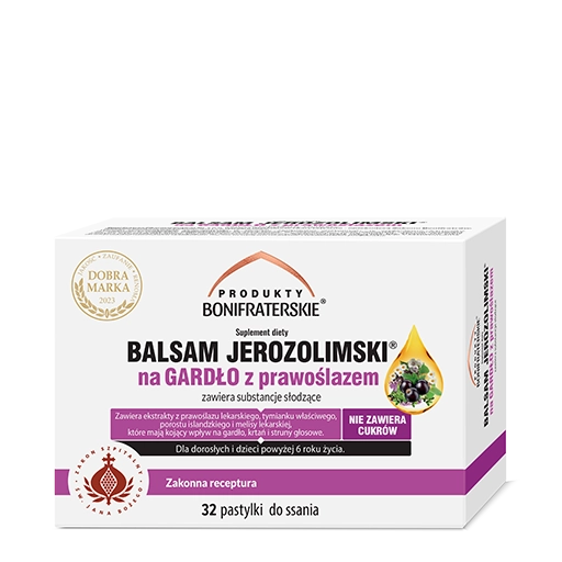 BALSAM JEROZOLIMSKI® na GARDŁO suplement diety to pastylki do ssania stworzone w trosce o prawidłowe funkcjonowanie gardła*, w oparciu o 400 lat doświadczenia Zakonu Bonifratrów. Zawiera wyciąg złożony – Balsam Jerozolimski® – ekstrakt z ziół według zakonnej receptury. Produkt zawiera wyselekcjonowane składniki.