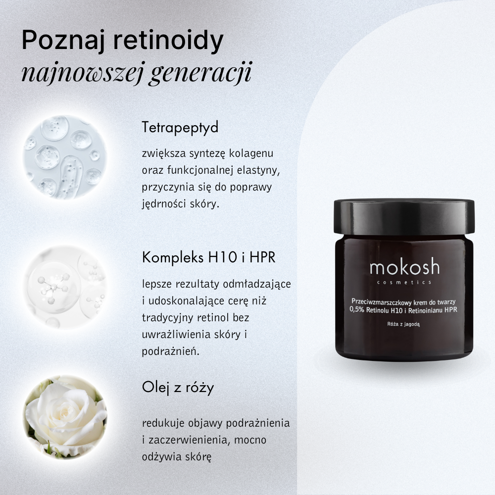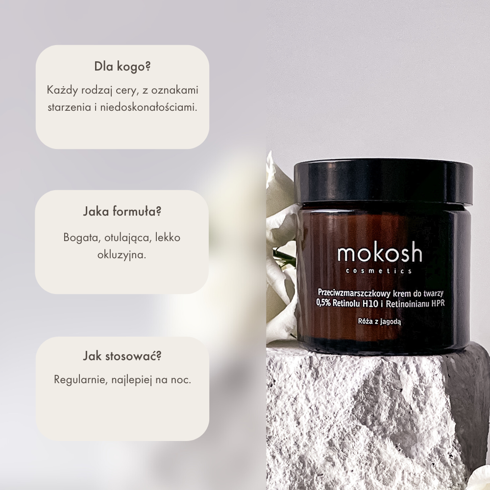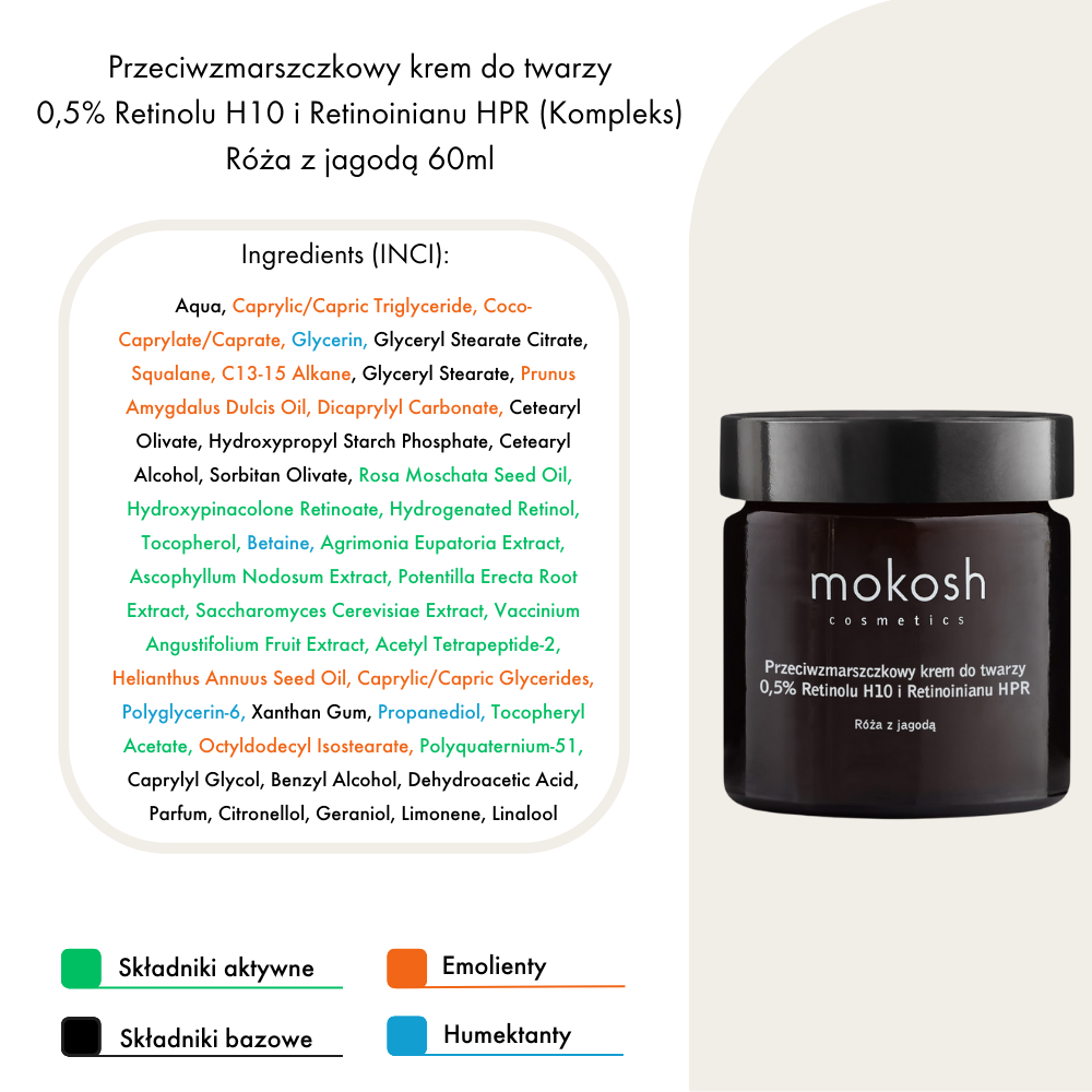 MOKOSH Przeciwzmarszczkowy krem do twarzy 0,5% (Retinolu H10 i Retinoinianu HPR) Róża z jagodą 60ml