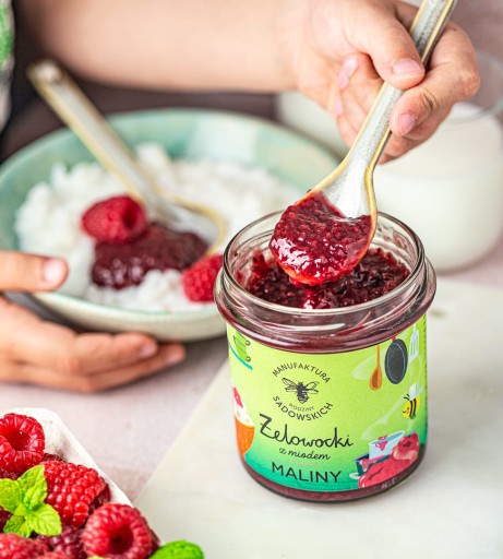 Składniki: maliny 70%, miód nektarowy wielokwiatowy 24%, skrobia modyfikowana, woda